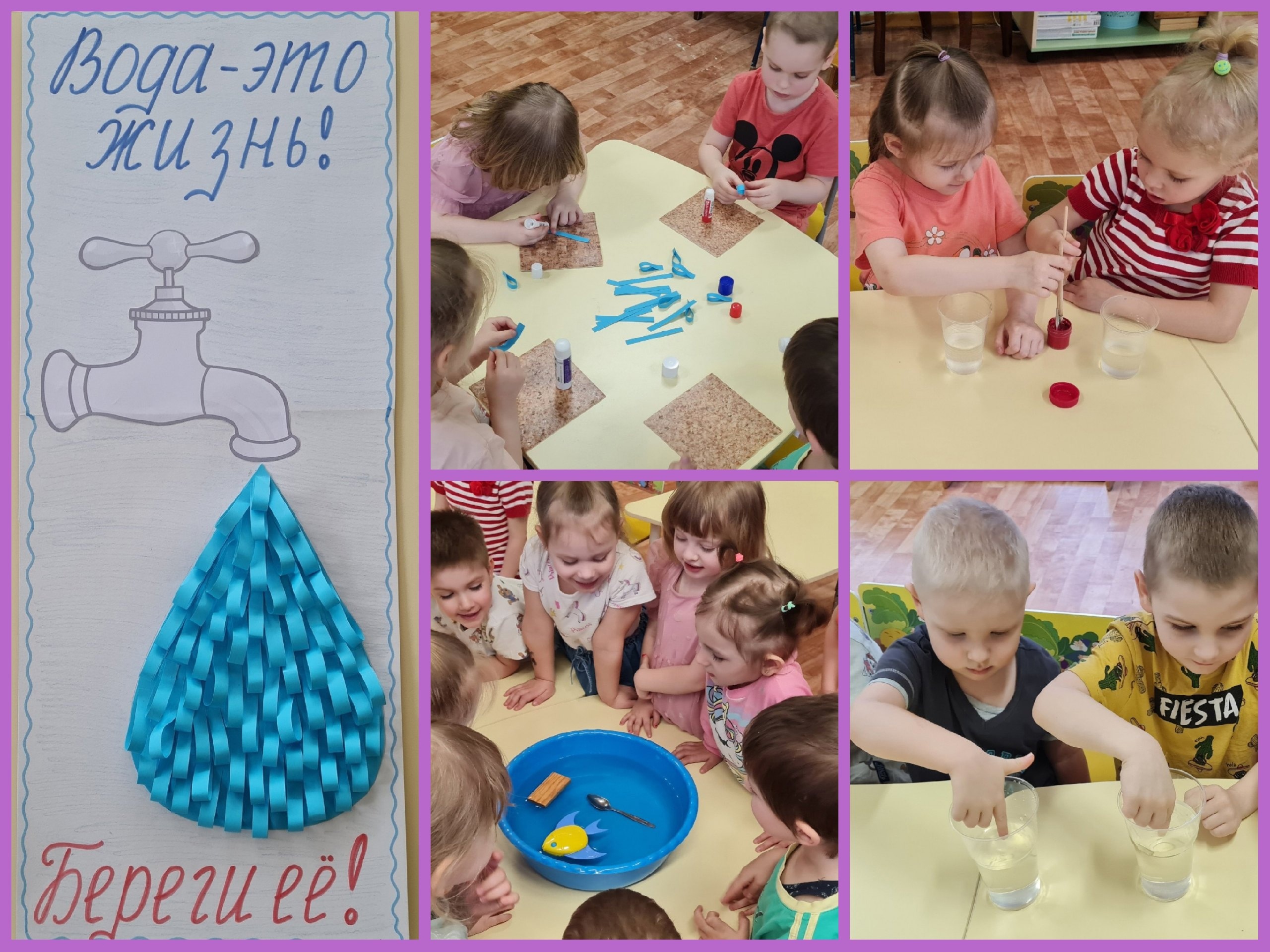 В группе "Солнышко" целый день был посвящен Волшебнице воде. Детям рассказали для чего нужна вода и о том, что нужно ее беречь, провели опыты "Разноцветная вода", поиграли в игры "Рыбки в воде", "Тонет не тонет".