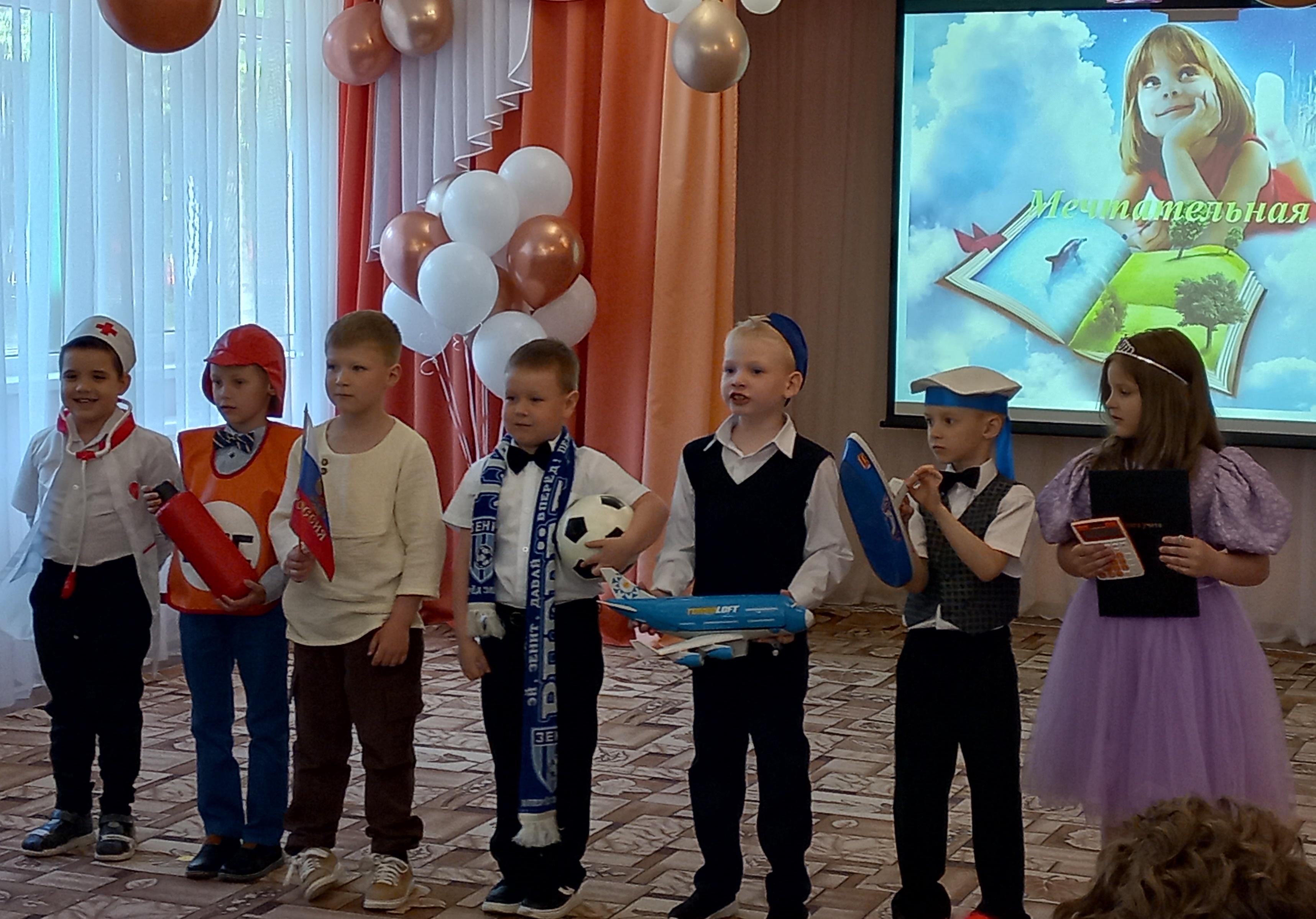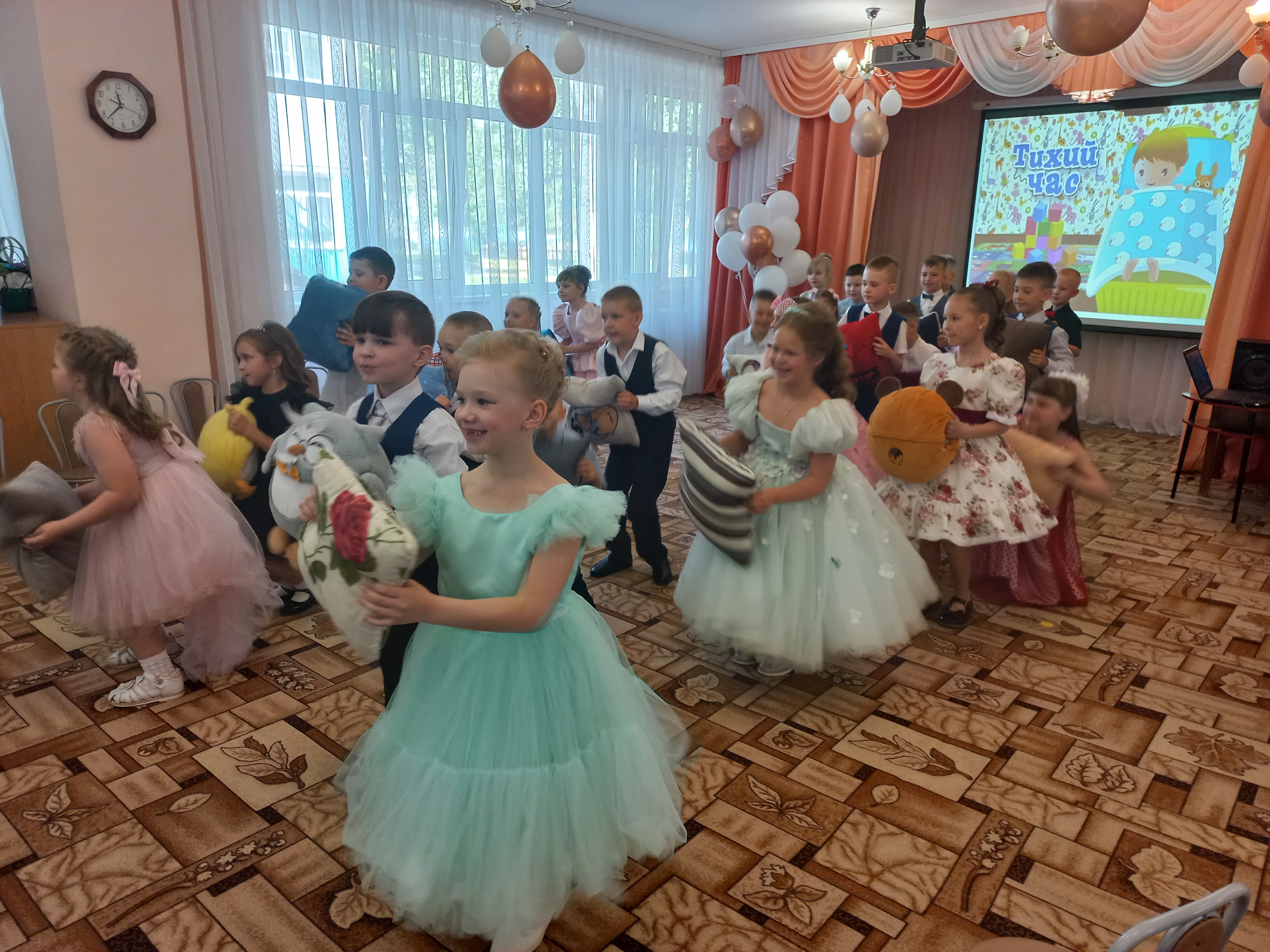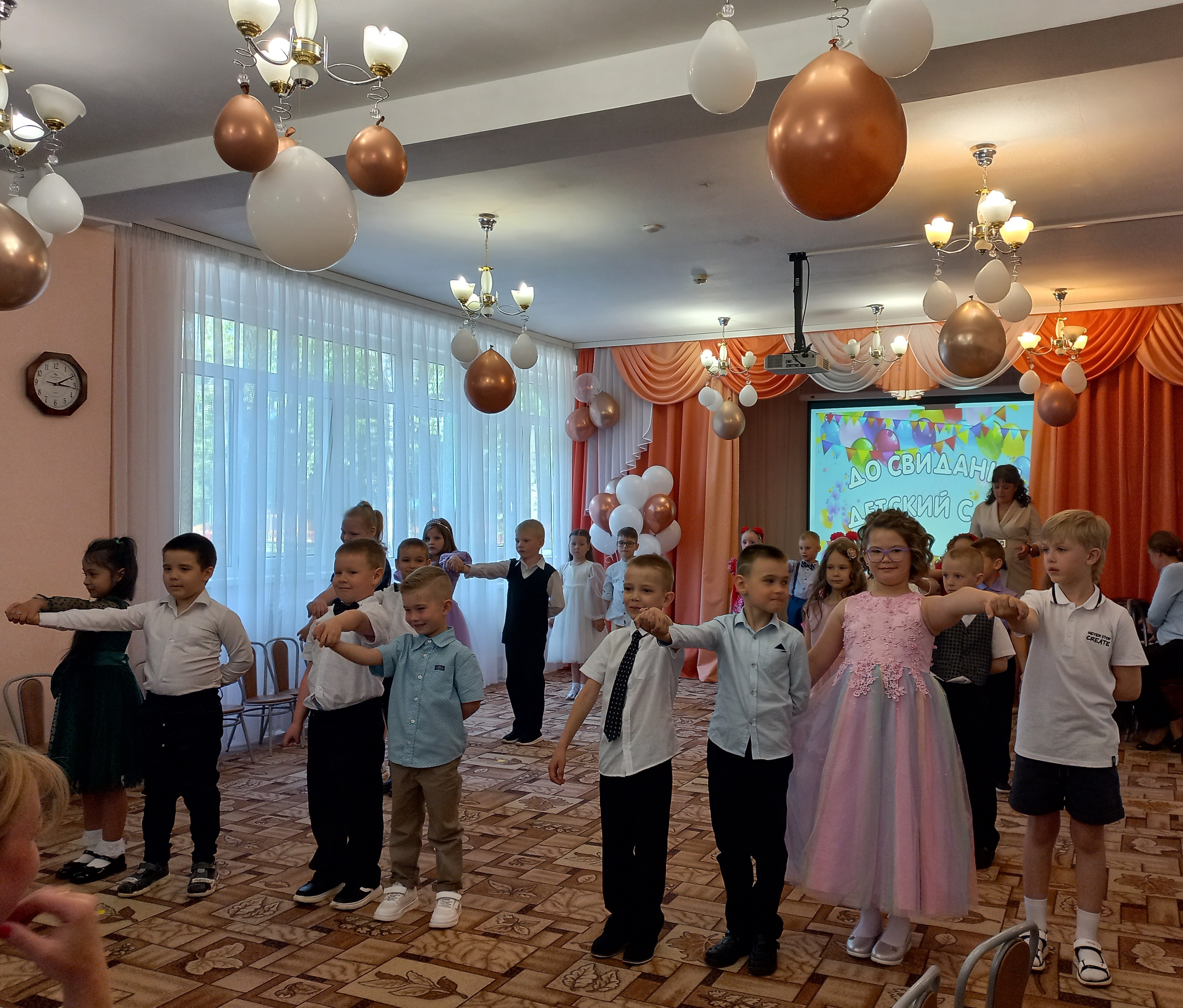 На праздниках подготовительных к школе групп «Карамельки» и «Непоседы» царила атмосфера торжества и волнения. Начались праздники с торжественного выхода выпускников — дети как-то сразу повзрослели: красивые, нарядные, они стали похожи на школьников. Наши воспитанники показали свои знания и умения, которые приобрели за годы, проведенные в детском саду: спели много песен, рассказали стихи, порадовали танцами, показали сценку "Не хочу учиться!".