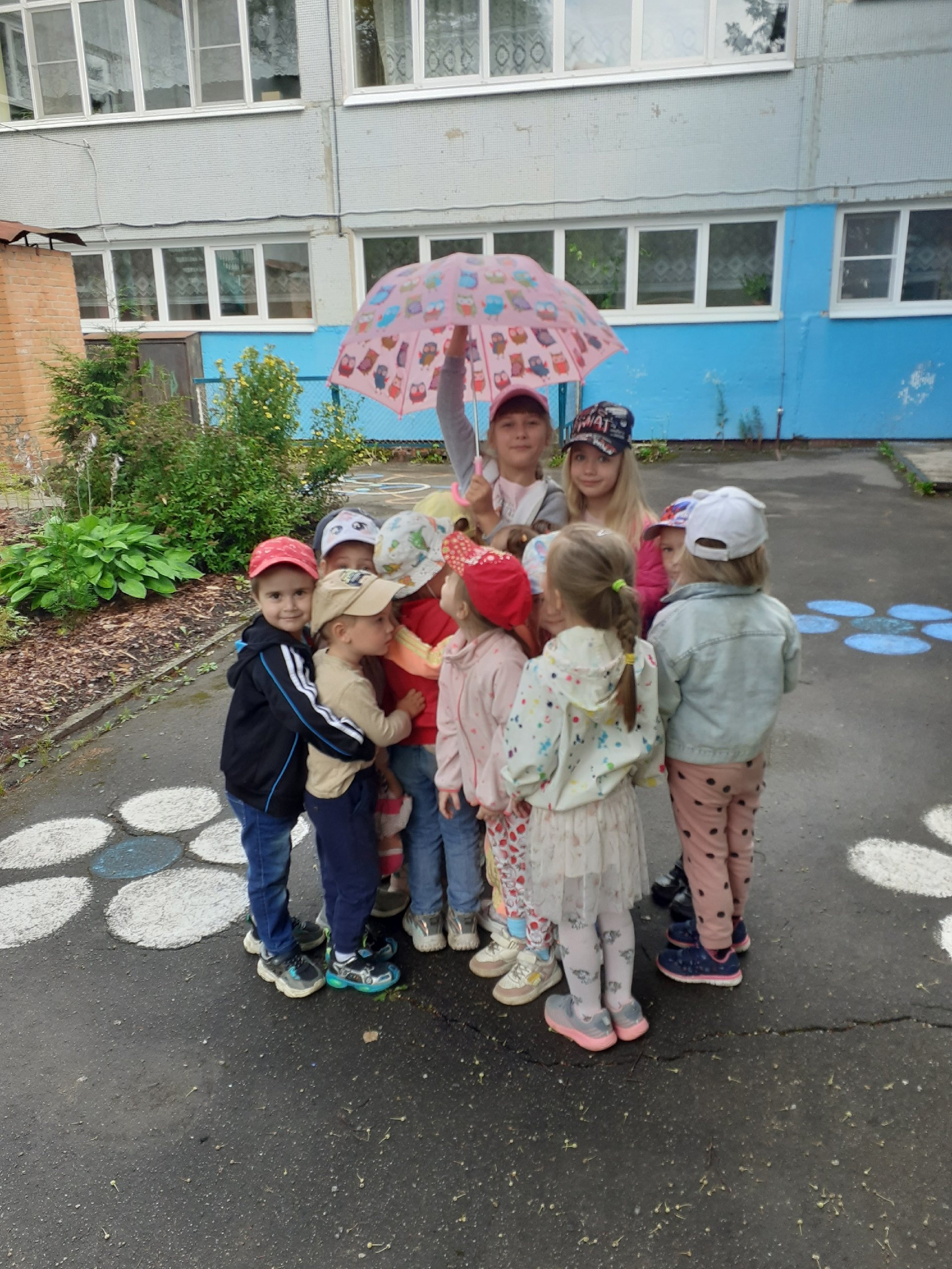 Ребята побывали на метеостанции, поиграли в подвижную игру "Солнышко и дождик", с удовольствием наблюдали за хмурыми серыми тучами, начинающимся дождем, а затем за лужами на асфальте. В технике пластилинография изобразили дождик