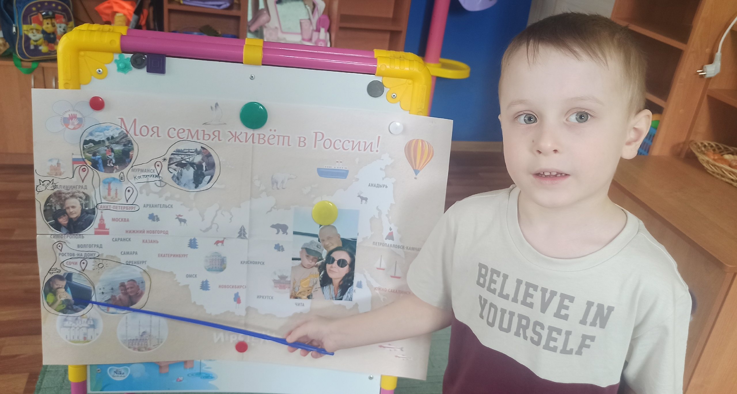 Наши лидеры акции - родители воспитанников из группы "Смешарики" - семья Вадима Пономарева и семья Никиты Лыкова выполнили творческий модуль, изготовив тематические коллажи «Сила моей семьи». Они отметили знаковые для семей места на карте России. А дети рассказали об этих местах, почему они так важны для их семей.